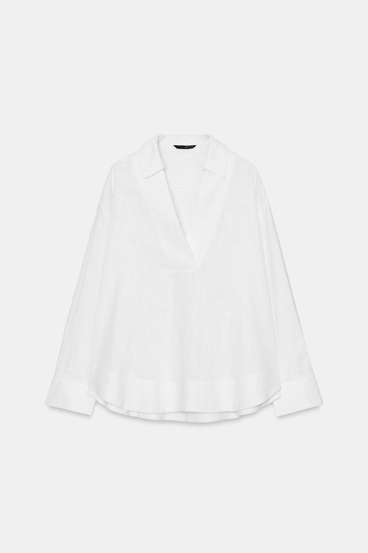 ZARA БЛУЗА-ПОЛО ИЗ ЛЬНА, БЕЛЫЙ