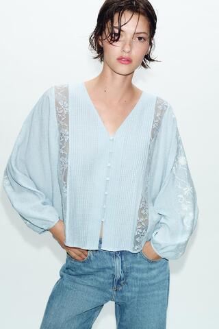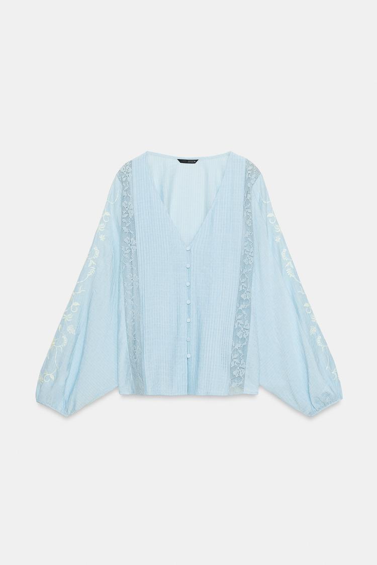 ZARA БЛУЗА С КОНТРАСТНОЙ ВЫШИВКОЙ, ПАСТЕЛЬНО-СИНИЙ