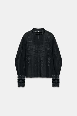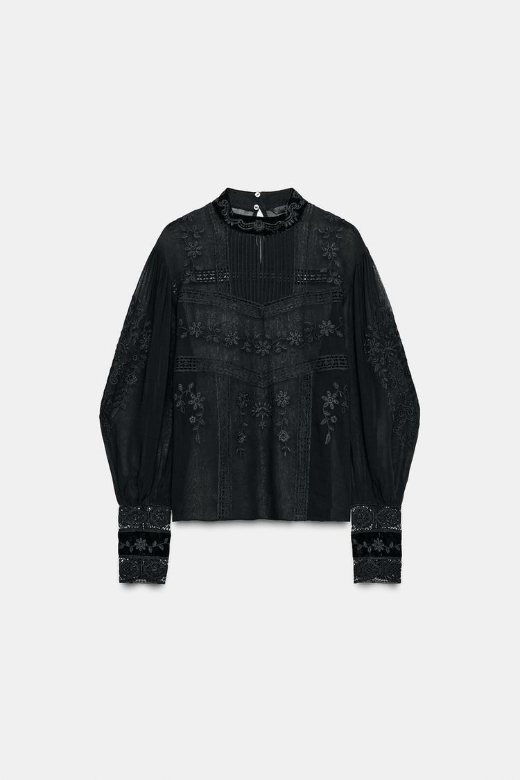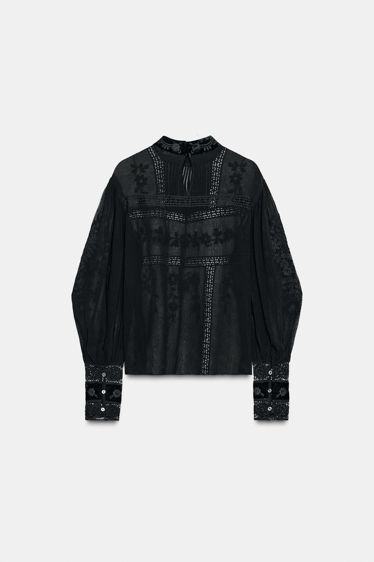 ZARA БЛУЗА С КРУЖЕВОМ ИЗ БАРХАТА — ZW COLLECTION, ЧЕРНЫЙ