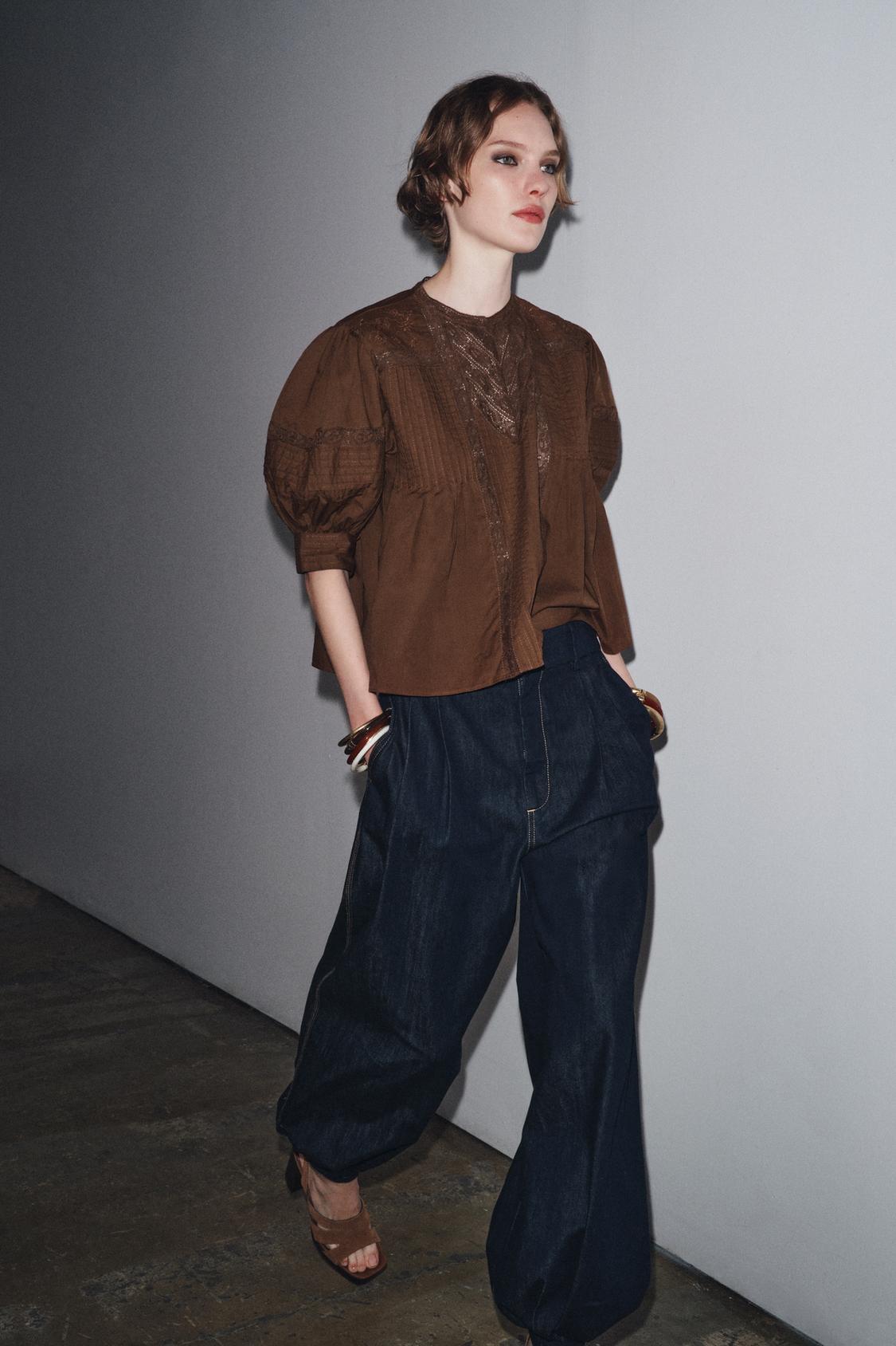 ZARA БЛУЗА С КРУЖЕВОМ - ZW COLLECTION, КОРИЧНЕВЫЙ