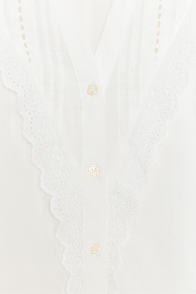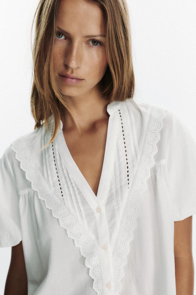 Блуза с V-образным вырезом и короткими объемными рукавами. Сборки и воланы спереди. Ажурная вышивка в тон и кружевные детали. Застегивается на пуговицы.