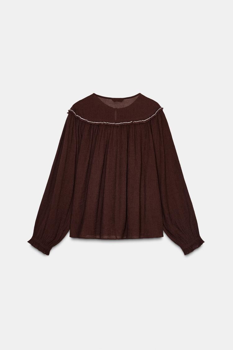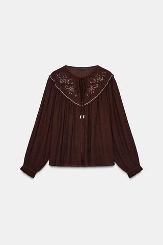 ZARA БЛУЗА С ВЫШИВКОЙ И БИСЕРОМ, БАКЛАЖАННЫЙ