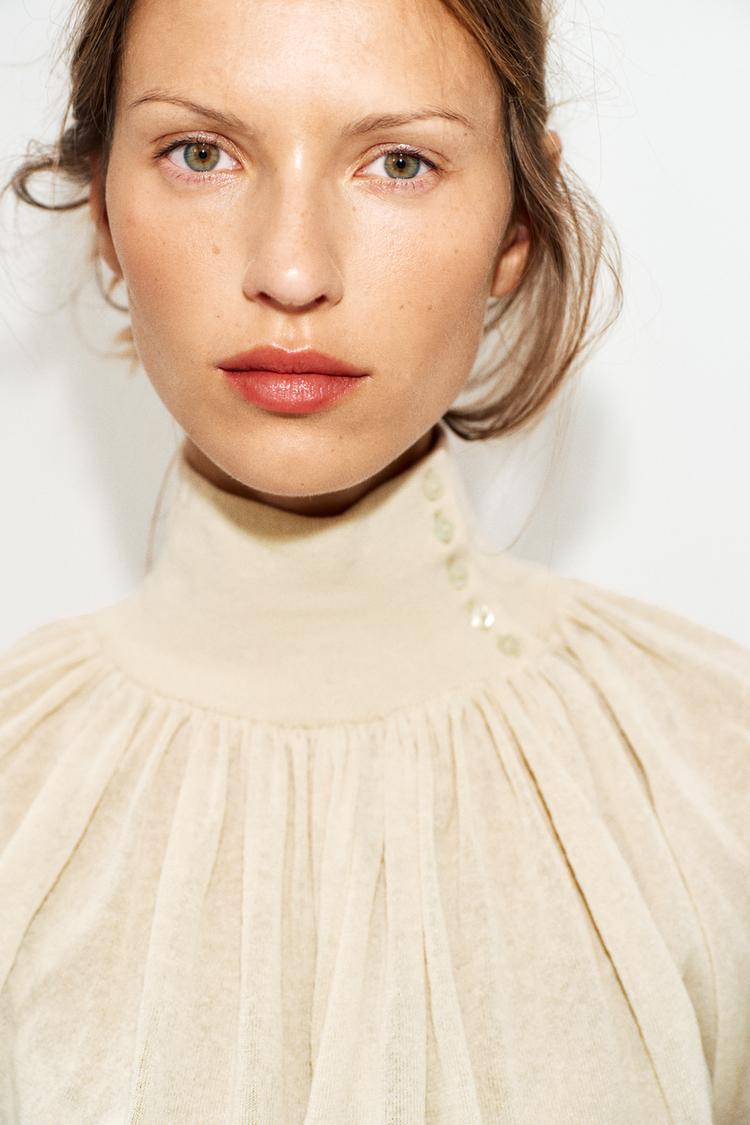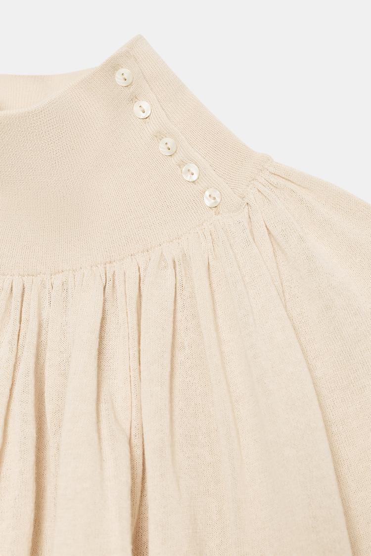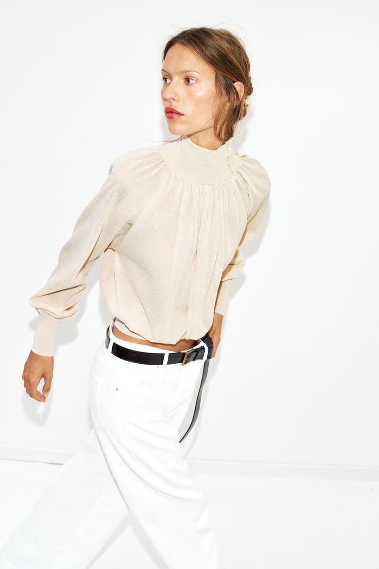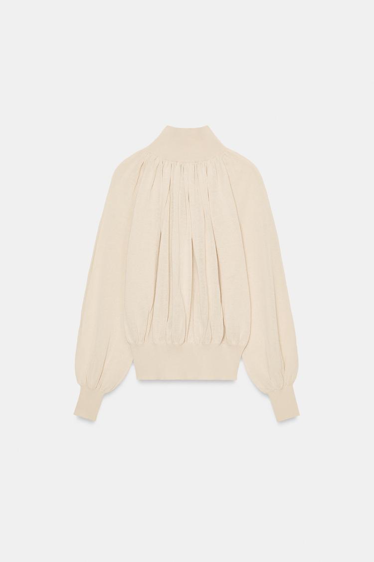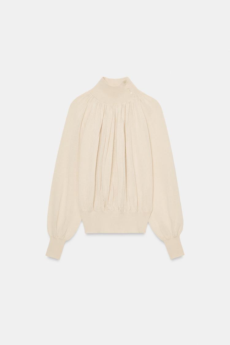 ZARA БЛУЗА СВОБОДНОГО КРОЯ ИЗ КОМБИНИРОВАННОГО ТРИКОТАЖА, ПЕСОЧНЫЙ