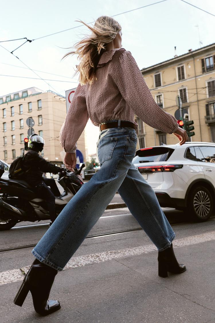 ZARA БЛУЗА В КЛЕТКУ ВИШИ С ВОЛАНАМИ, БОРДОВЫЙ/ЭКРЮ