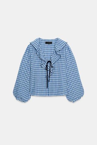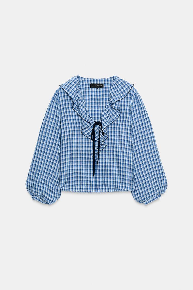 ZARA БЛУЗА В КЛЕТКУ ВИШИ С ВОЛАНАМИ, СИНИЙ/БЕЛЫЙ