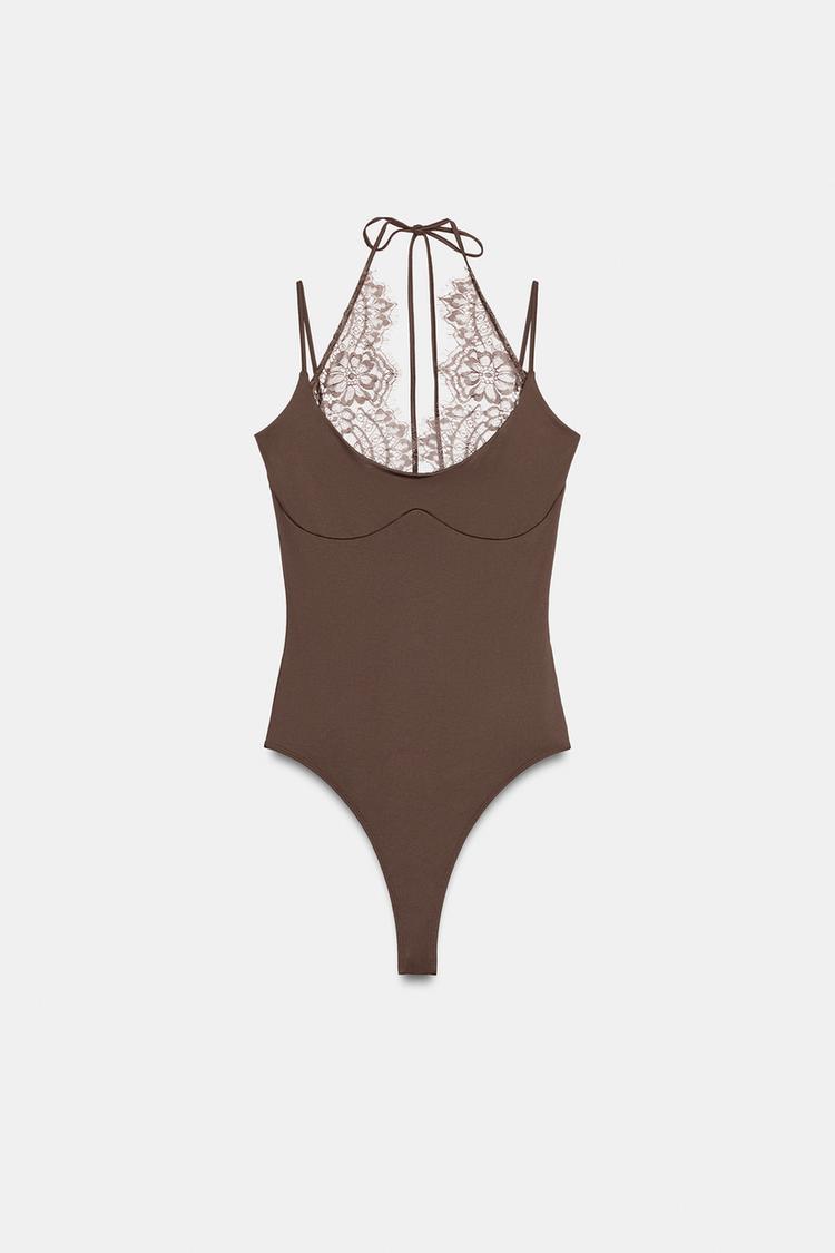 ZARA БОДИ ХАЛТЕР С КОМБИНИРОВАННЫМ КРУЖЕВОМ, ШОКОЛАДНЫЙ
