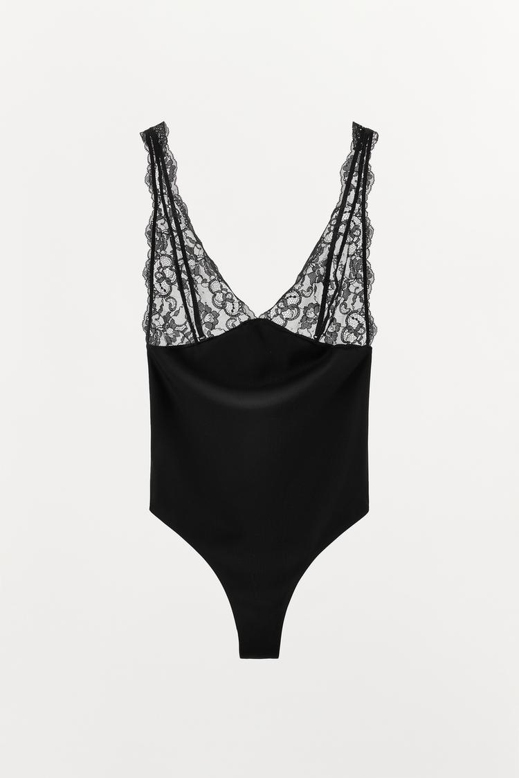 ZARA БОДИ ИЗ ПОЛИАМИДА С КРУЖЕВОМ, ЧЕРНЫЙ