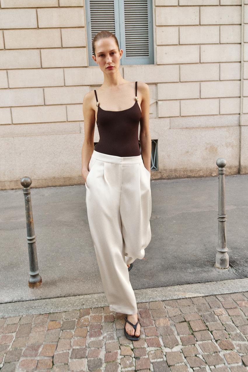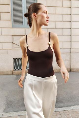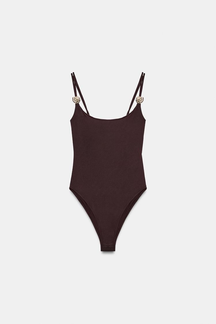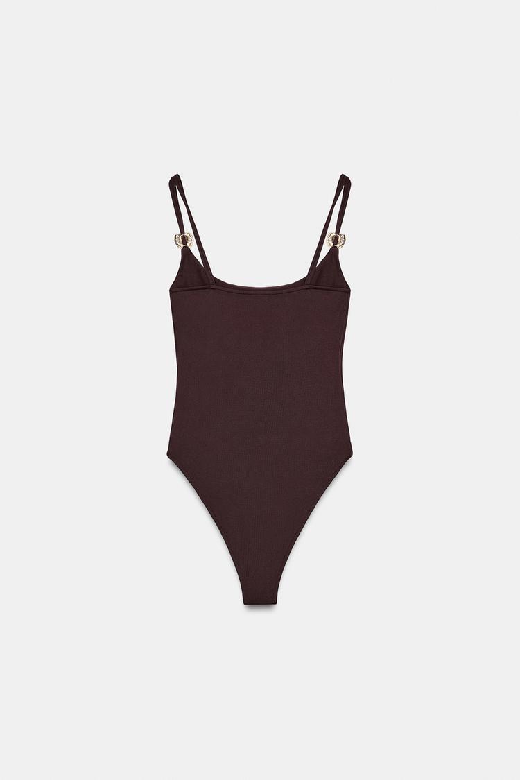 ZARA БОДИ ИЗ ПОЛИАМИДА С МЕТАЛЛИЧЕСКОЙ ДЕТАЛЬЮ, ТЕМНО-КОРИЧНЕВЫЙ
