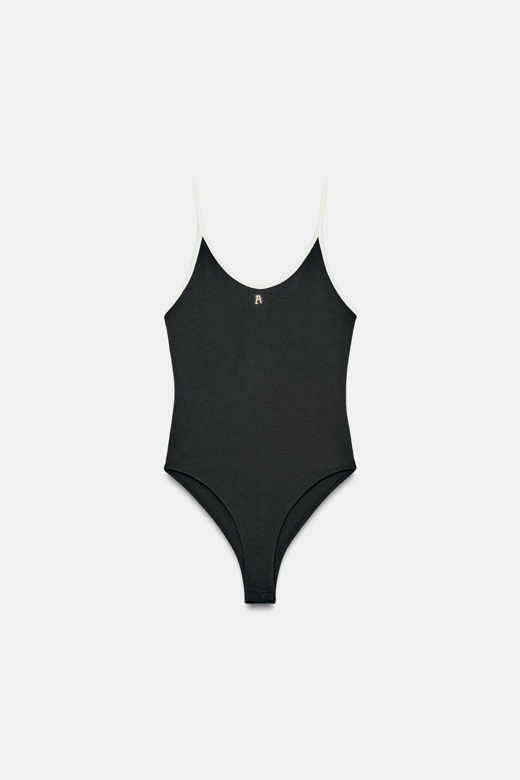 Боди из пряжи со смесовым хлопком. Круглый вырез и тонкие бретели. Металлическая аппликация ZA спереди. Контрастная отделка. Застегивается на кнопки снизу.