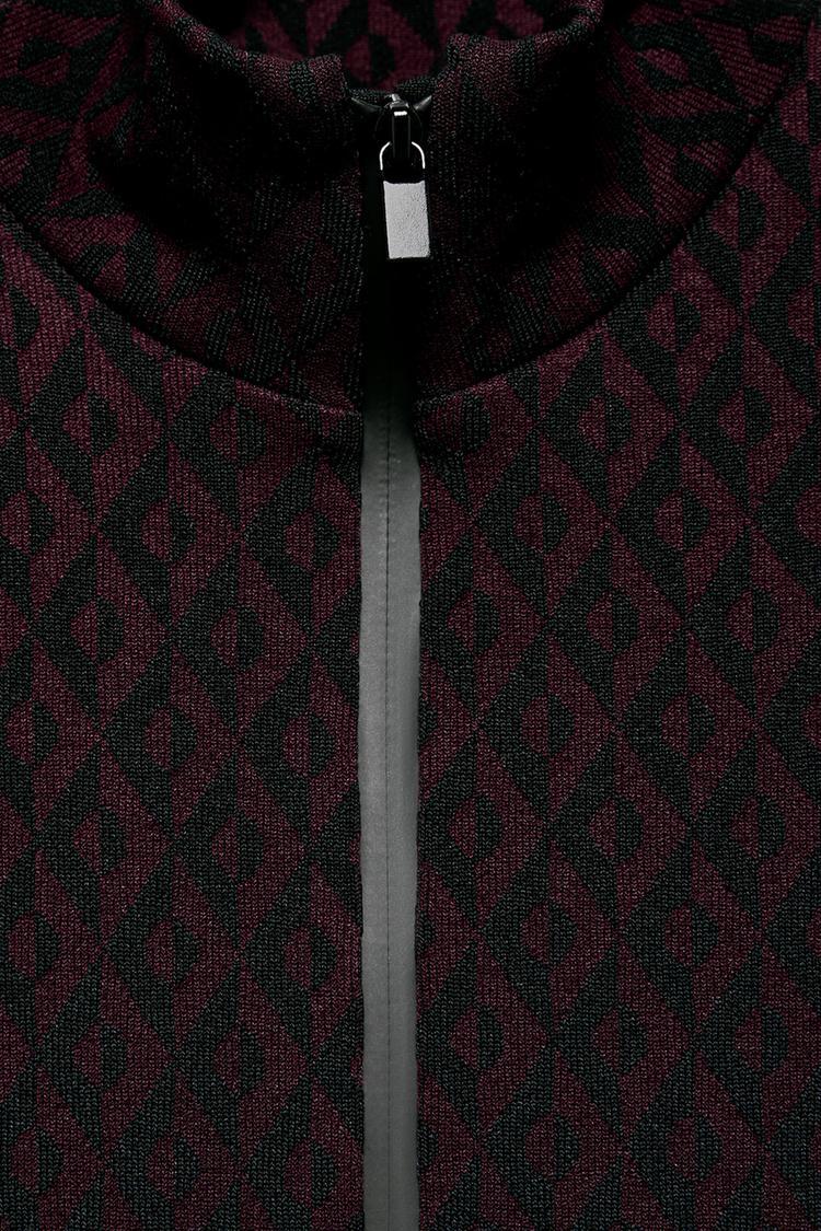 Легкий, мягкий на ощупь боди с узким кроем. Высокий воротник и длинные рукава. Жаккардовая ткань с деталями в гармонирующих цветах. Передняя молния и застежка-кнопка внизу.