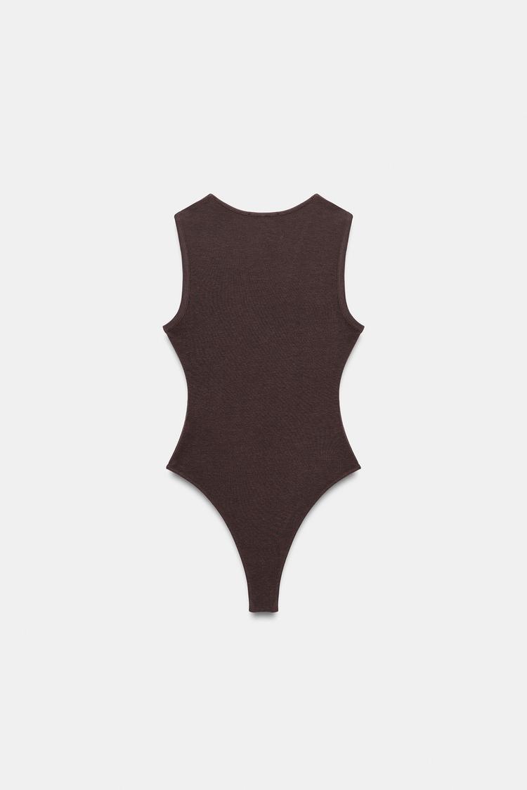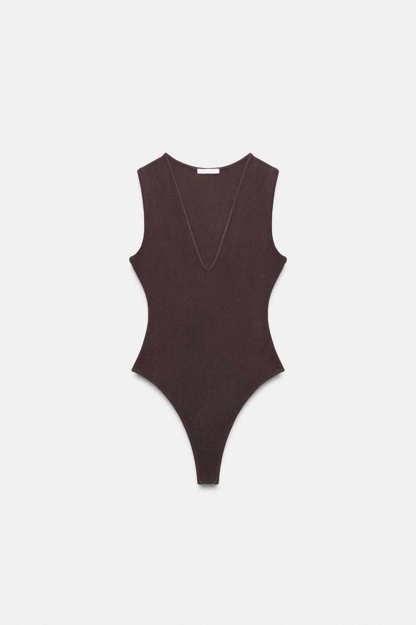 ZARA БОДИ ПРИТАЛЕННОЕ С V-ОБРАЗНЫМ ВЫРЕЗОМ, КОРИЧНЕВЫЙ
