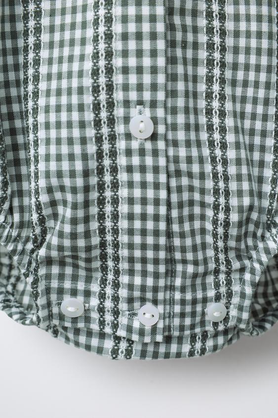 Боди с круглым воротником и длинными рукавами на резинке. Застегивается на пуговицы спереди и снизу. Принт в клетку виши и вышитые детали.