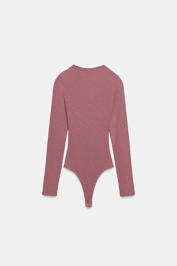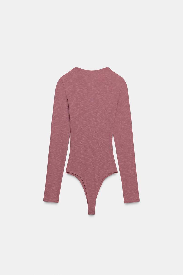 Боди с воротником-стойкой и длинными рукавами. Ткань в рубчик. Застегивается на кнопки снизу.