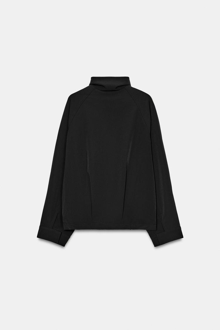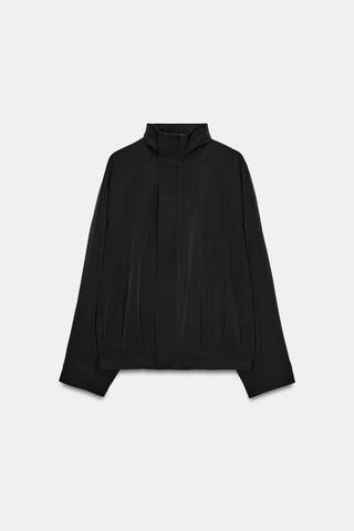 Свободный бомбер с высоким воротником и длинными рукавами. Детали в виде складок спереди. Регулируемый низ с эластичным шнурком и стопперами. Застежка на металлическую молнию и пуговицы, скрытые планкой.