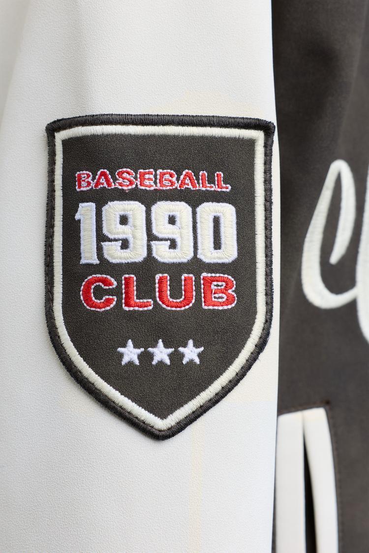 Бомбер с флисовым капюшоном и длинными рукавами из искусственной кожи. Отделка в рубчик. Застежка на кнопки спереди. Передние прорезные карманы. Декоративная вышивка спереди и нашивка на рукаве.