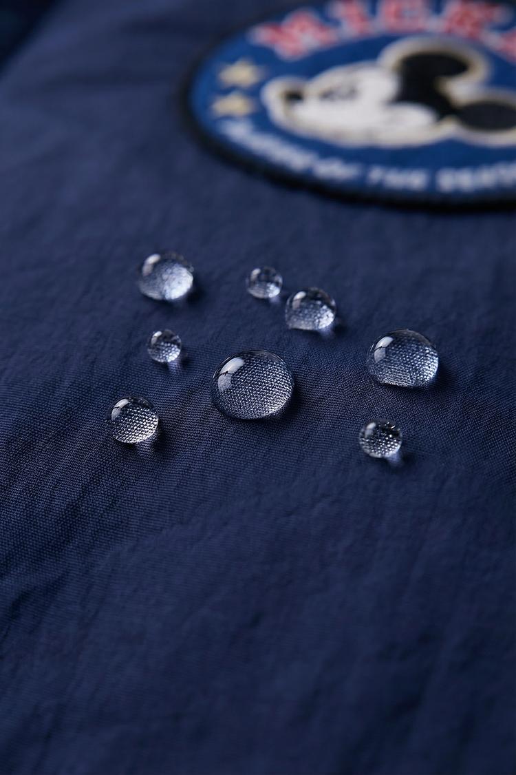 Бомбер с круглым вырезом и длинными рукавами с манжетами. Низ на резинке. Застежка на кнопки спереди. Передние прорезные карманы. Нашивки MICKEY MOUSE © DISNEY.