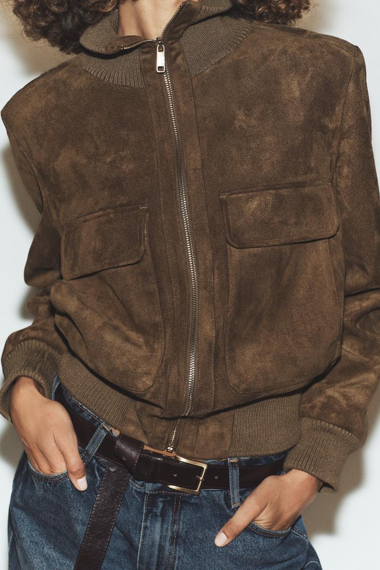 Куртка-бомбер из искусственной замши. Воротник-стойка, длинные рукава с манжетами. Передние накладные карманы с клапанами. Рубчатые кромки. Застежка-молния.