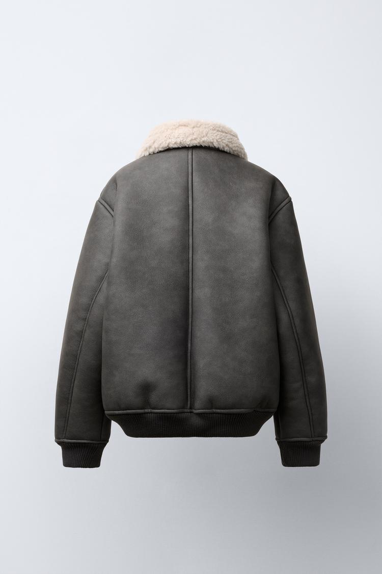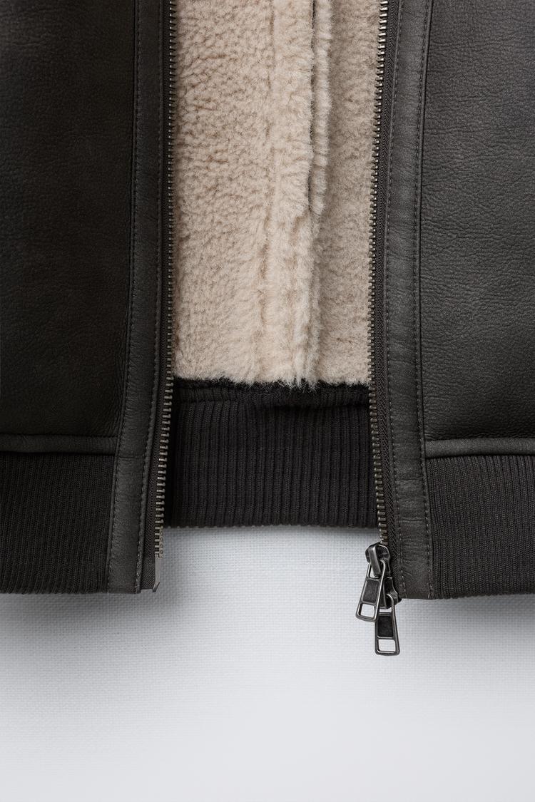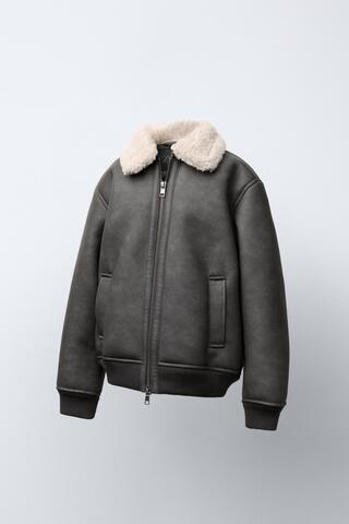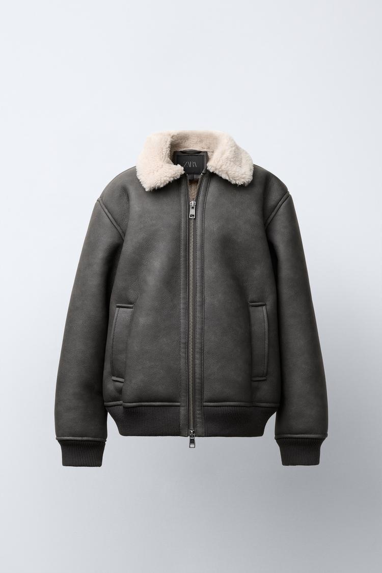 Бомбер с воротником с лацканами и длинными рукавами. Отделка в рубчик. Застежка-молния. Передние прорезные карманы. Внутренняя подкладка из овчины.
