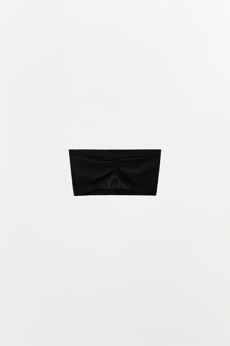 Бралетт бандо из смесового полиамида. Прямой вырез, открытые плечи. Отделка из ткани, имитирующей чулки, и драпировка на груди.