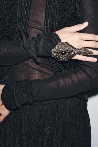 Украшение для руки, выполненное из резного элемента с пришитыми бусинами и крупным металлическим кольцом. Застежка с завязкой из ткани контрастного цвета.