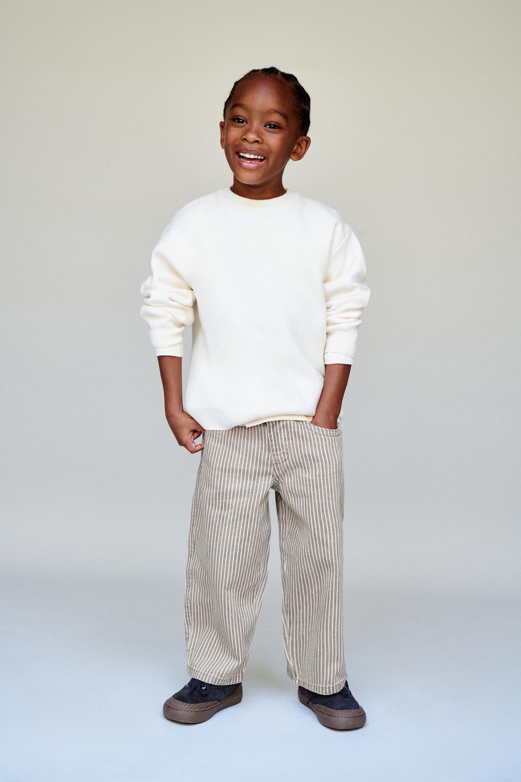 Брюки в стиле baggy с эластичным поясом и застежкой на кнопку спереди. Передние и задние накладные карманы. В полоску.
