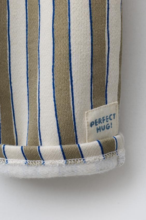 Брюки свободного кроя с эластичным поясом. В полоску, с нашивкой внизу. Внутренняя сторона с начесом, теплые и мягкие. Ткань на 82% состоит из хлопка.