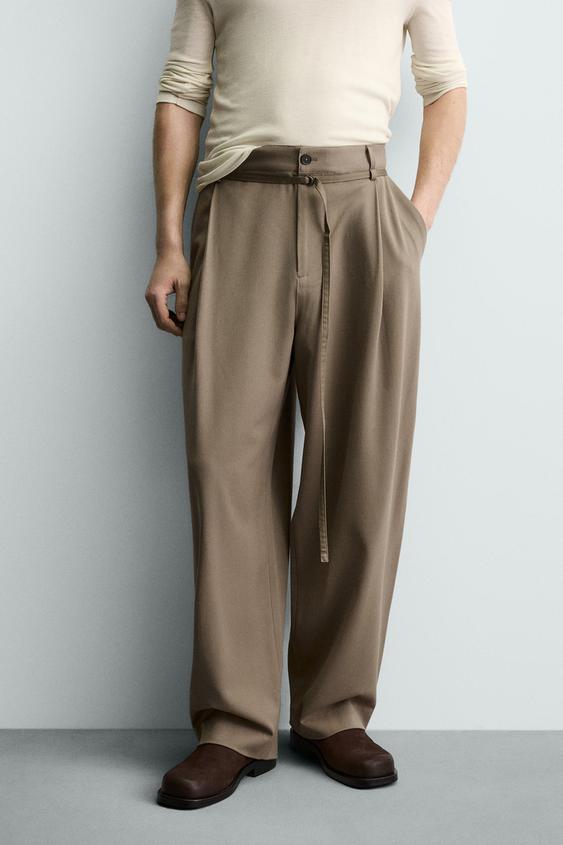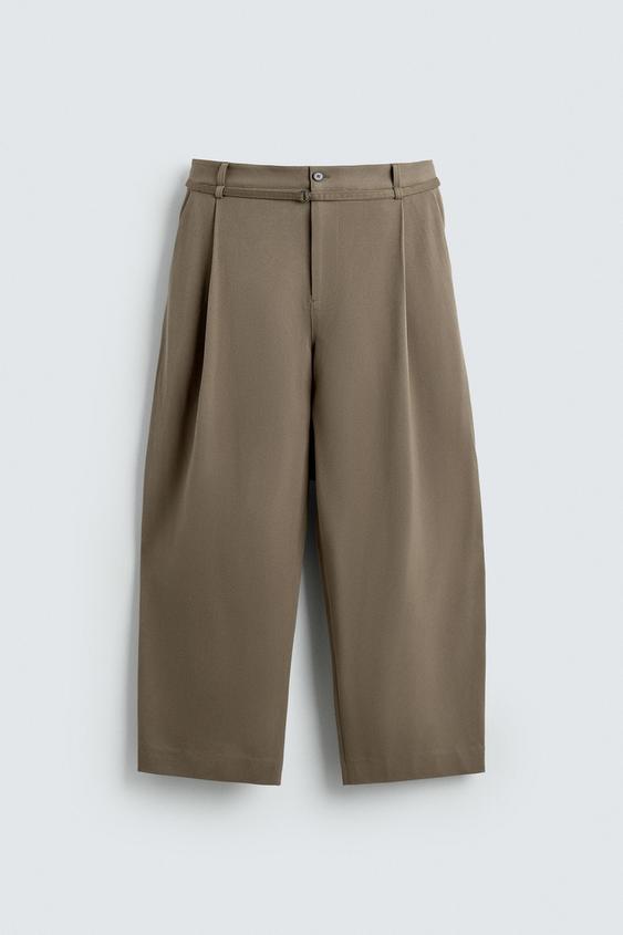 ZARA БРЮКИ BALLOON FIT С ЗАЩИПАМИ И ПОЯСОМ, СЕРО-КОРИЧНЕВЫЙ