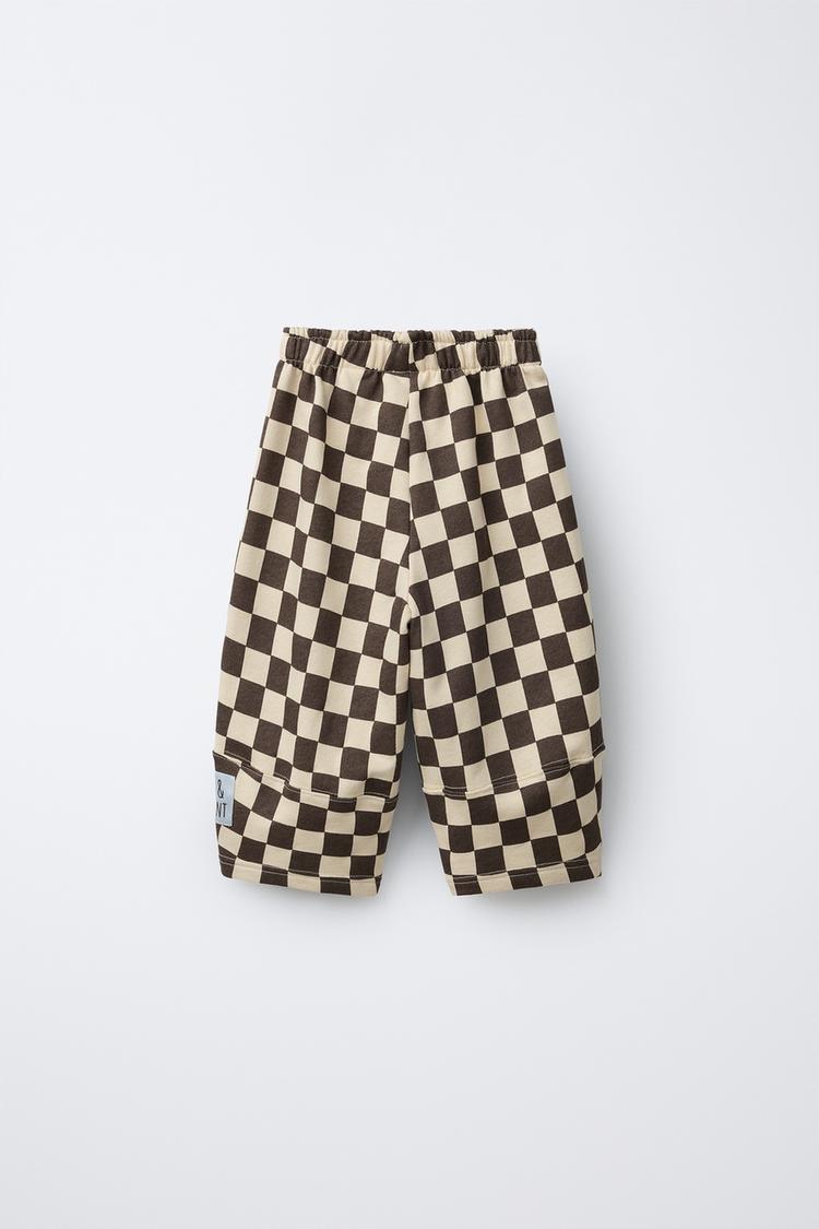 Брюки-бананы с эластичным поясом. Принт в шахматную клетку и нашивка сзади.