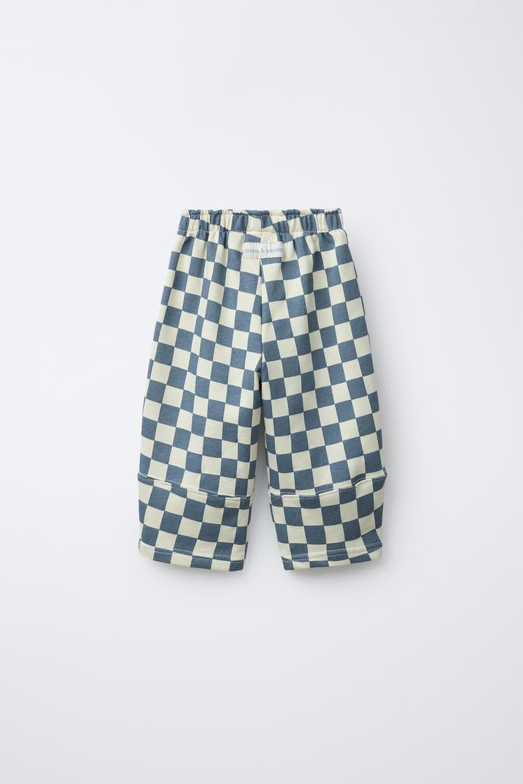 Брюки-бананы с эластичным поясом. Принт в шахматную клетку и нашивка сзади.
