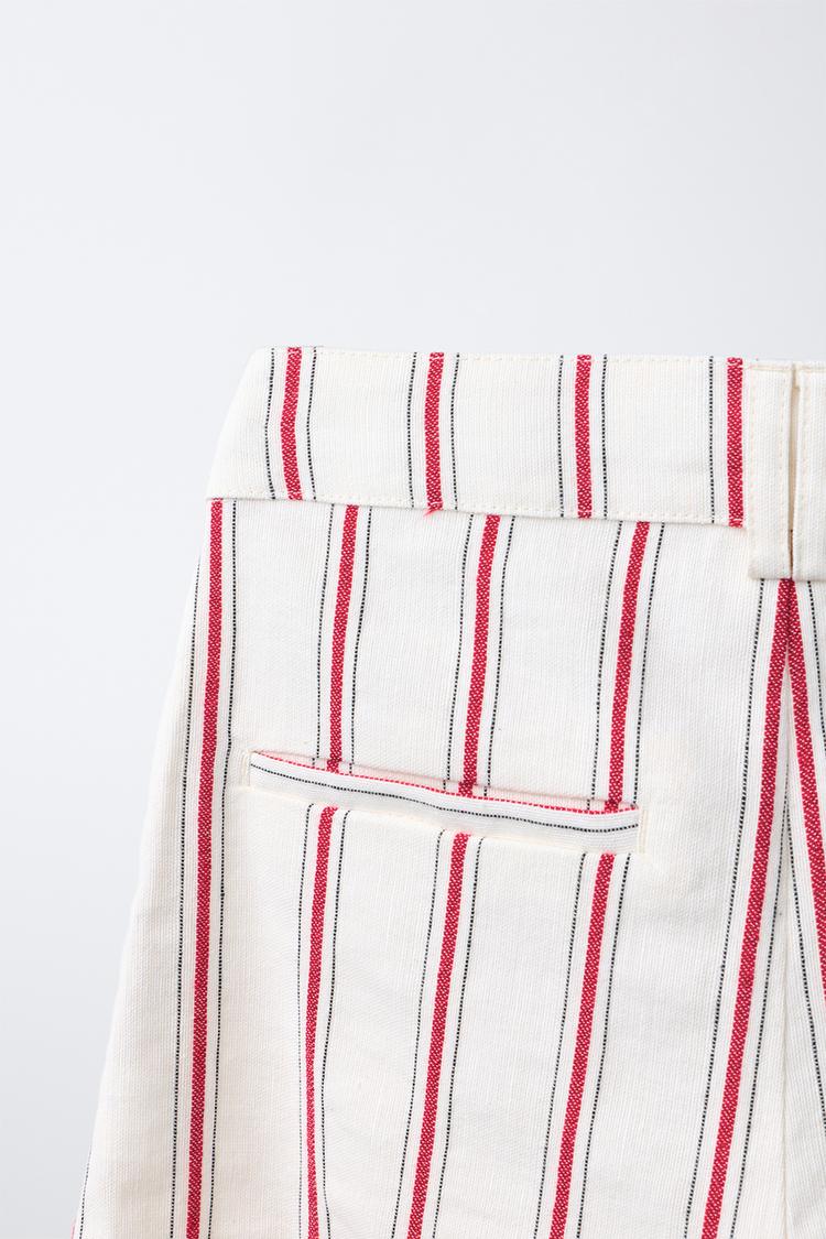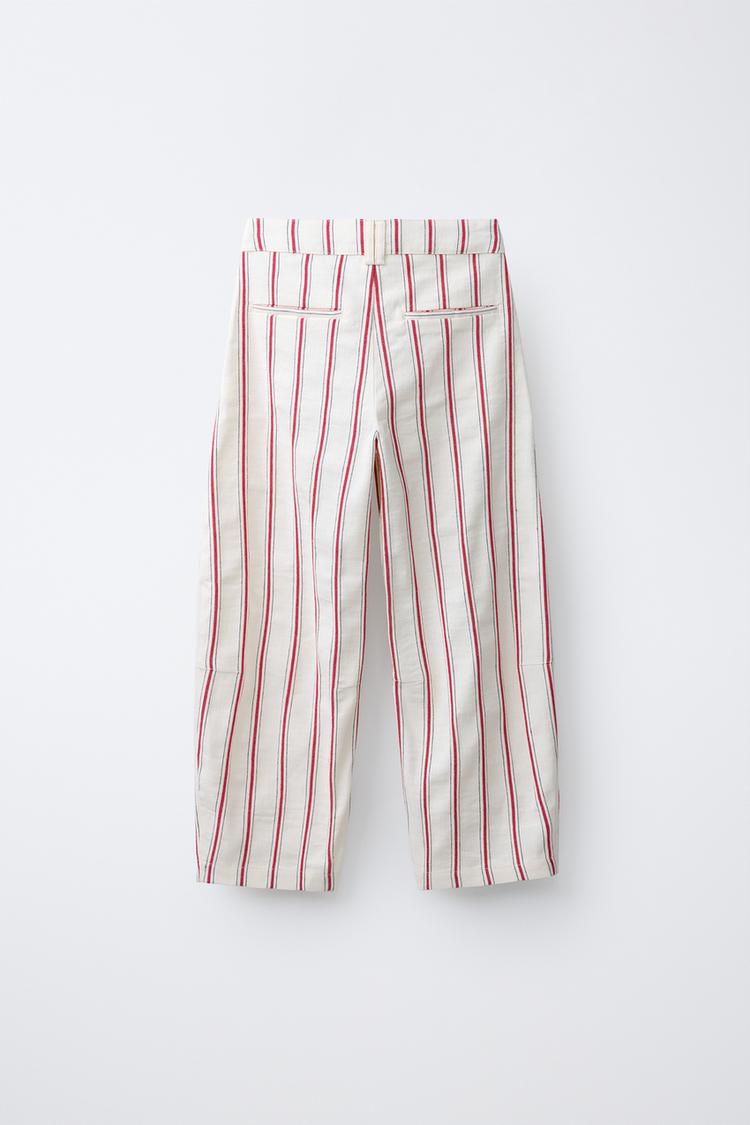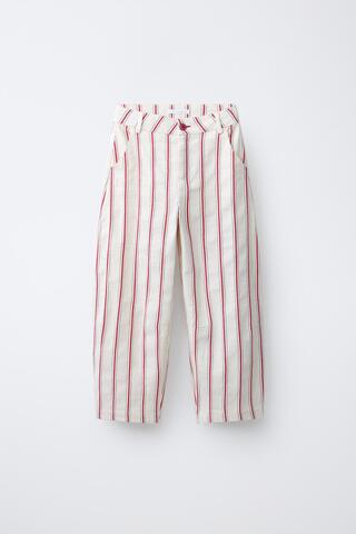 ZARA БРЮКИ BARREL ИЗ ХЛОПКА И ЛЬНА В ПОЛОСКУ, ЭКРЮ/КРАСНЫЙ