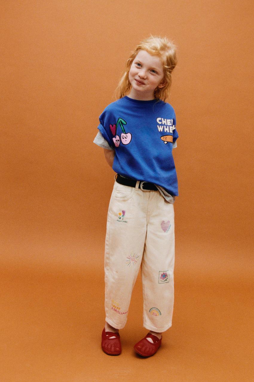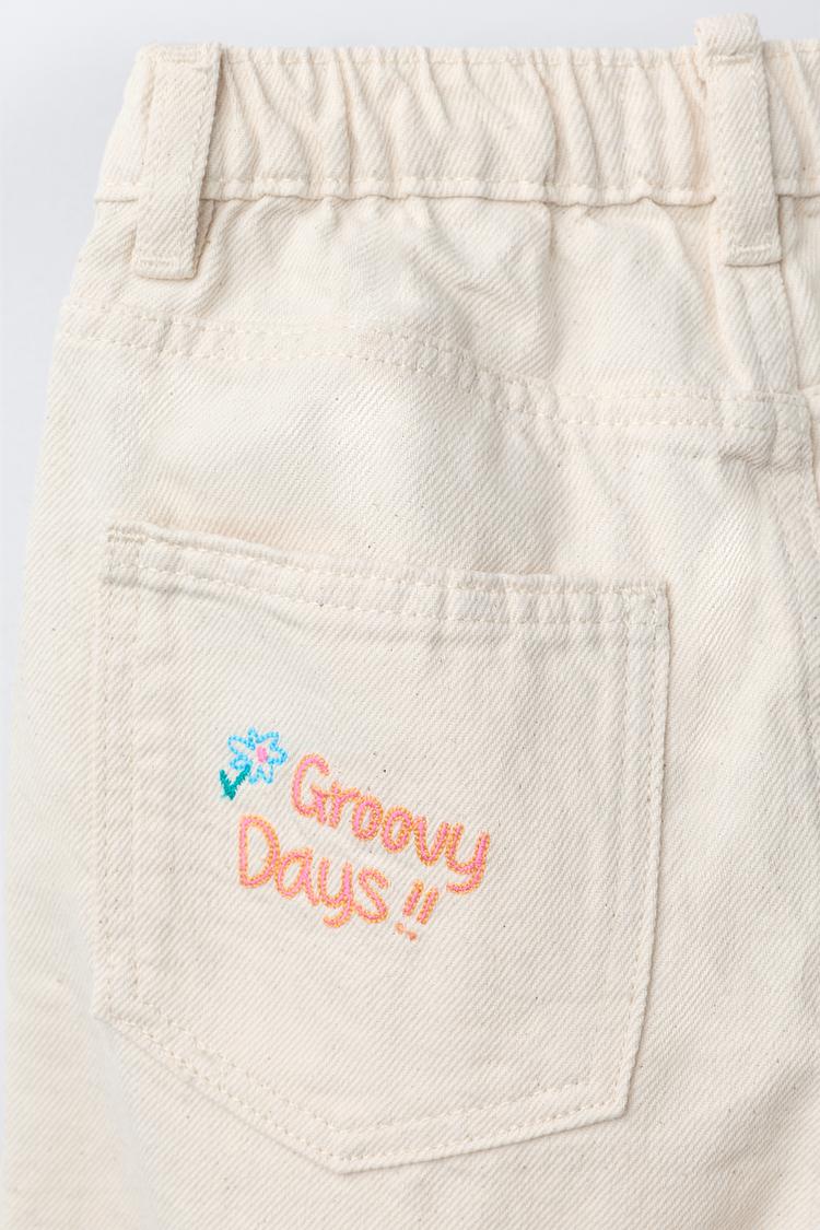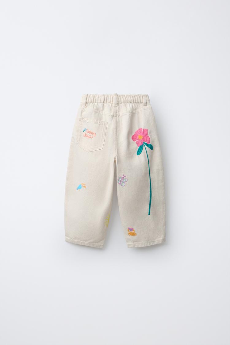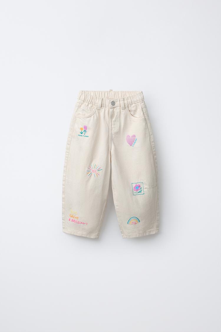 ZARA БРЮКИ BARREL ИЗ САРЖИ С ВЫШИВКОЙ, ЭКРЮ