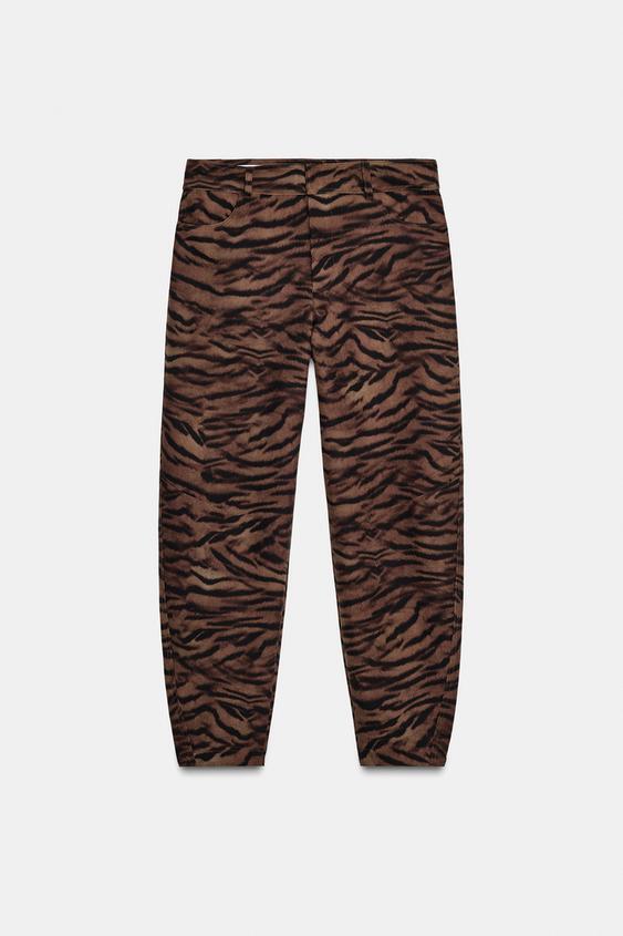 ZARA БРЮКИ BARREL С АНИМАЛИСТИЧЕСКИМ УЗОРОМ, ЧЕРНЫЙ/КОРИЧНЕВЫЙ