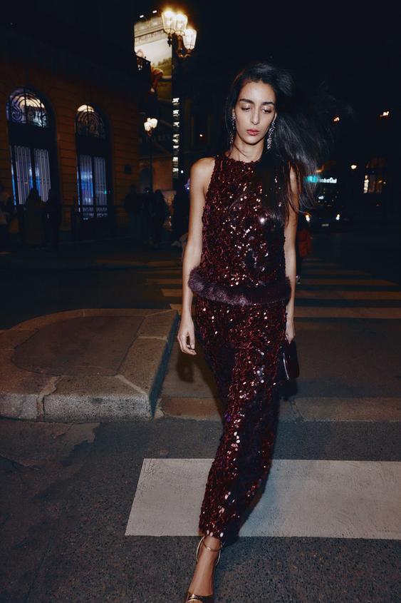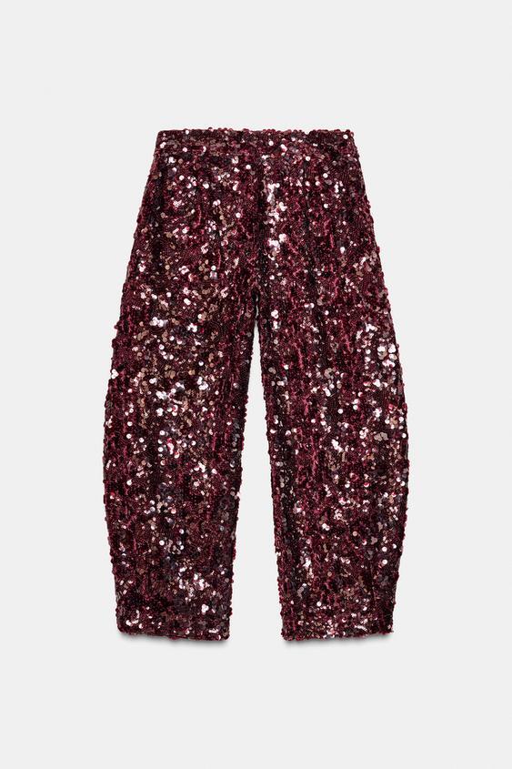 ZARA БРЮКИ BARREL С ПАЙЕТКАМИ, БУРГУНДИ