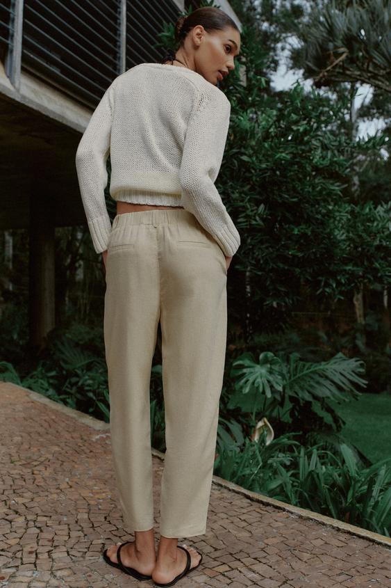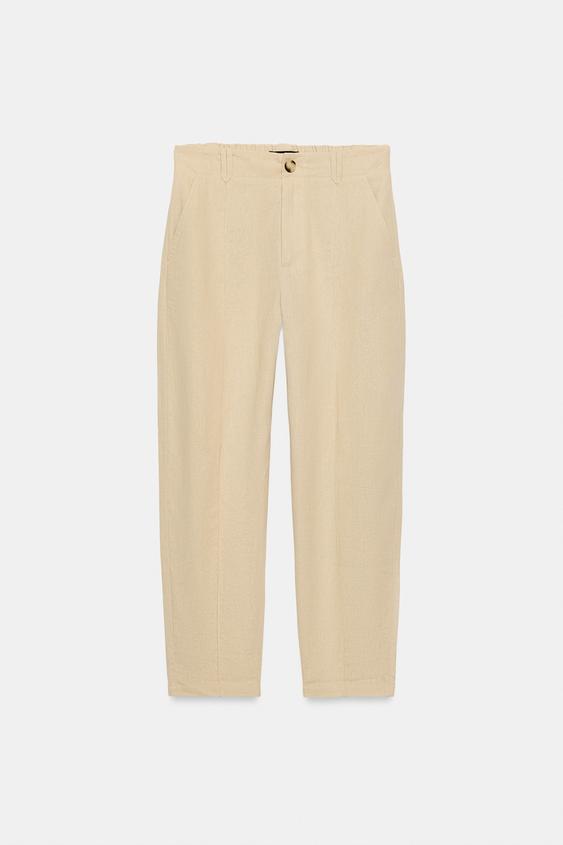 ZARA БРЮКИ CARROT FIT С ДЕКОРАТИВНОЙ СТРОЧКОЙ ИЗ ЛЬНА, ПЕСОЧНЫЙ