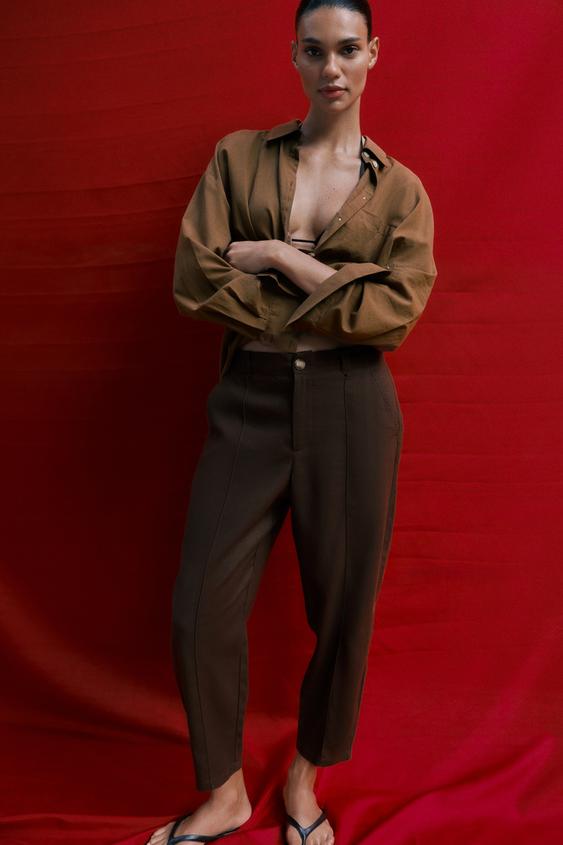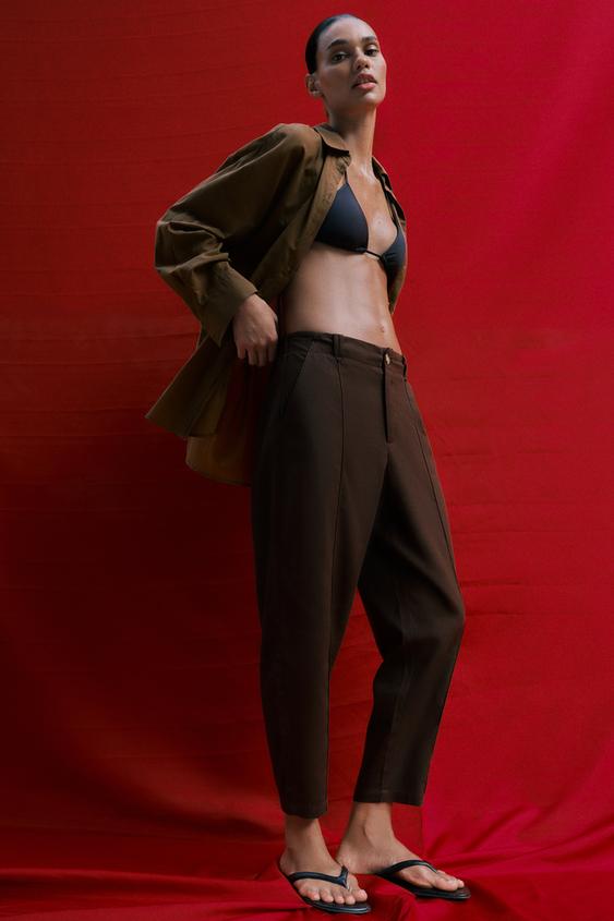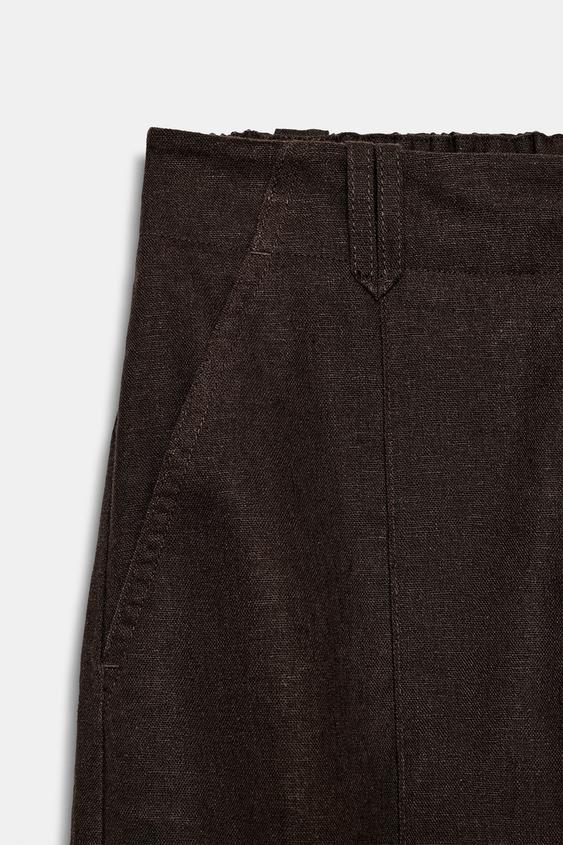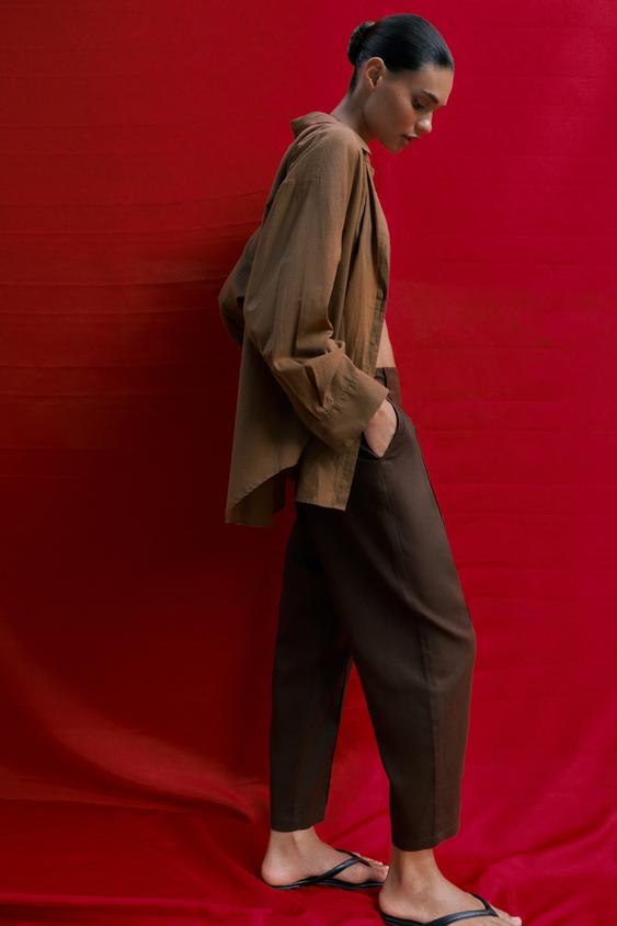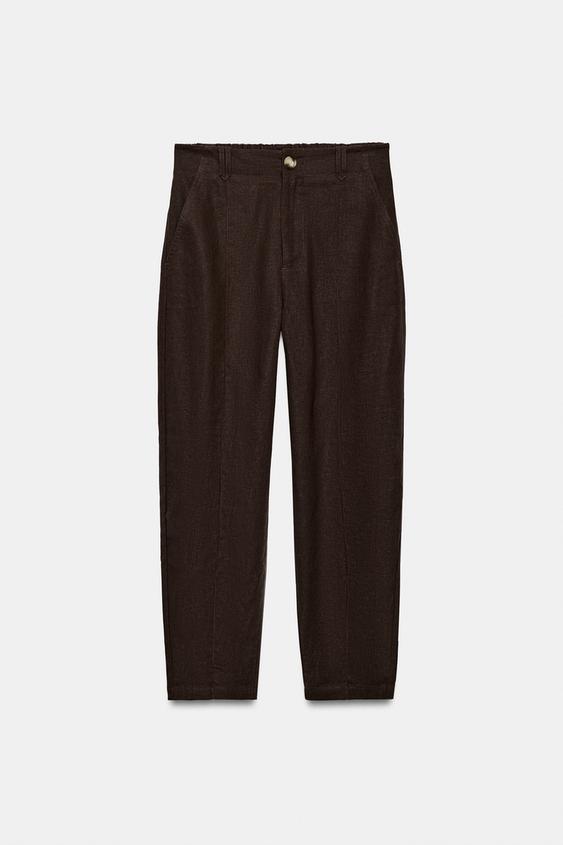 ZARA БРЮКИ CARROT FIT С ДЕКОРАТИВНОЙ СТРОЧКОЙ ИЗ ЛЬНА, ТЕМНО-КОРИЧНЕВЫЙ