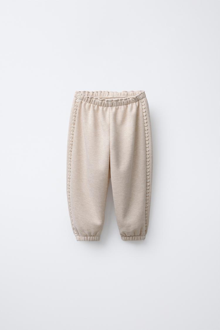 ZARA БРЮКИ-ДЖОГГЕРЫ С ЦВЕТОЧНЫМ КРУЖЕВОМ, ПЕСОЧНЫЙ МЕЛАНЖ