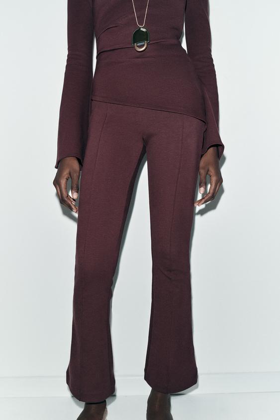 ZARA БРЮКИ FLARE ИЗ ИНТЕРЛОКА СО СТРЕЛКАМИ, ВИННЫЙ