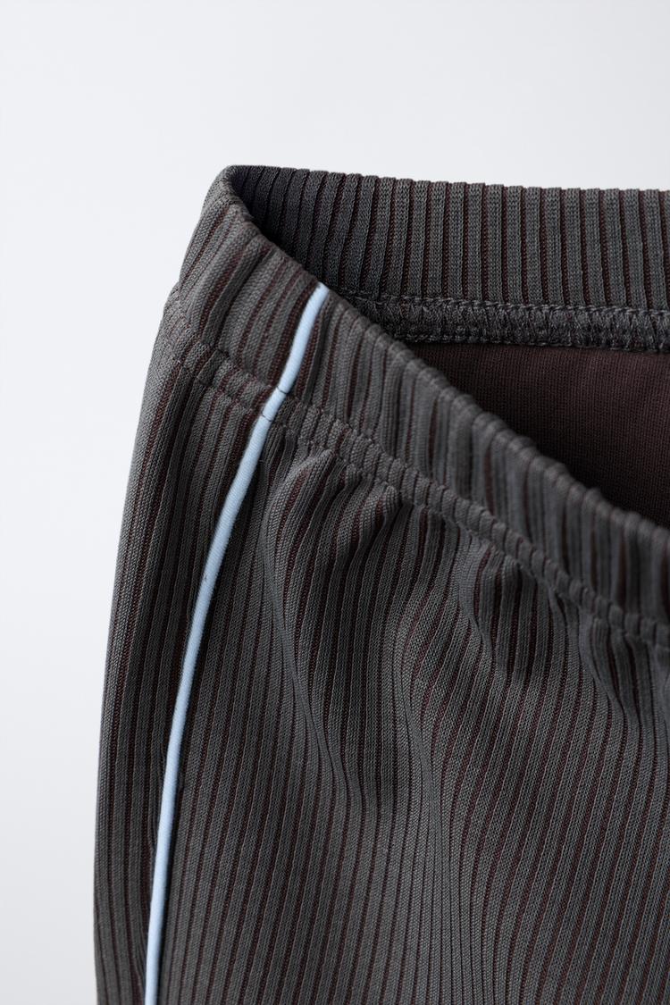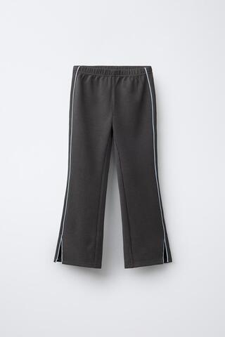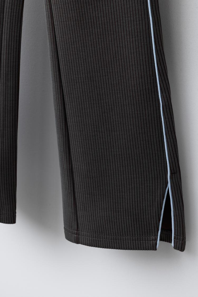 Расклешенные брюки в рубчик с эластичным поясом. Контрастные детали по бокам. Низ с боковым разрезом. Ткань с 22% модала.