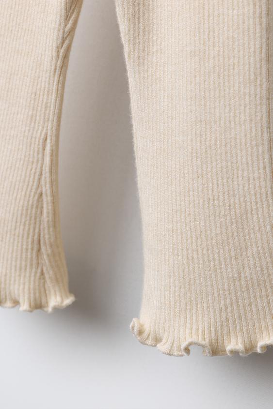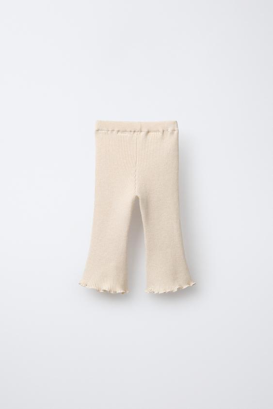Расклешенные брюки из трикотажа в рубчик с эластичным поясом и низом, отделанным швом в подгибку.