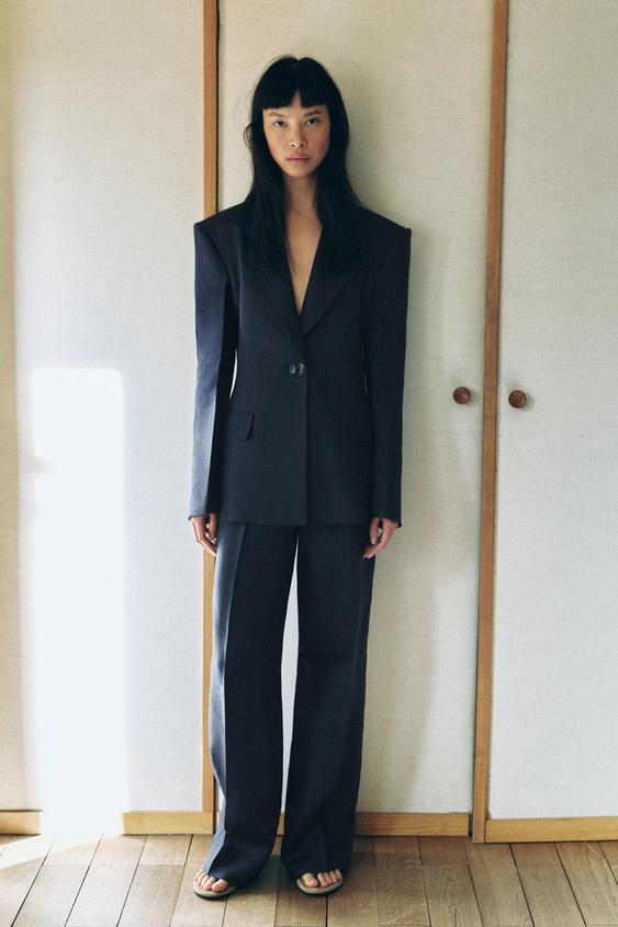 ZARA БРЮКИ ИЗ 100% ЛЬНА В ЕЛОЧКУ, ИНДИГО