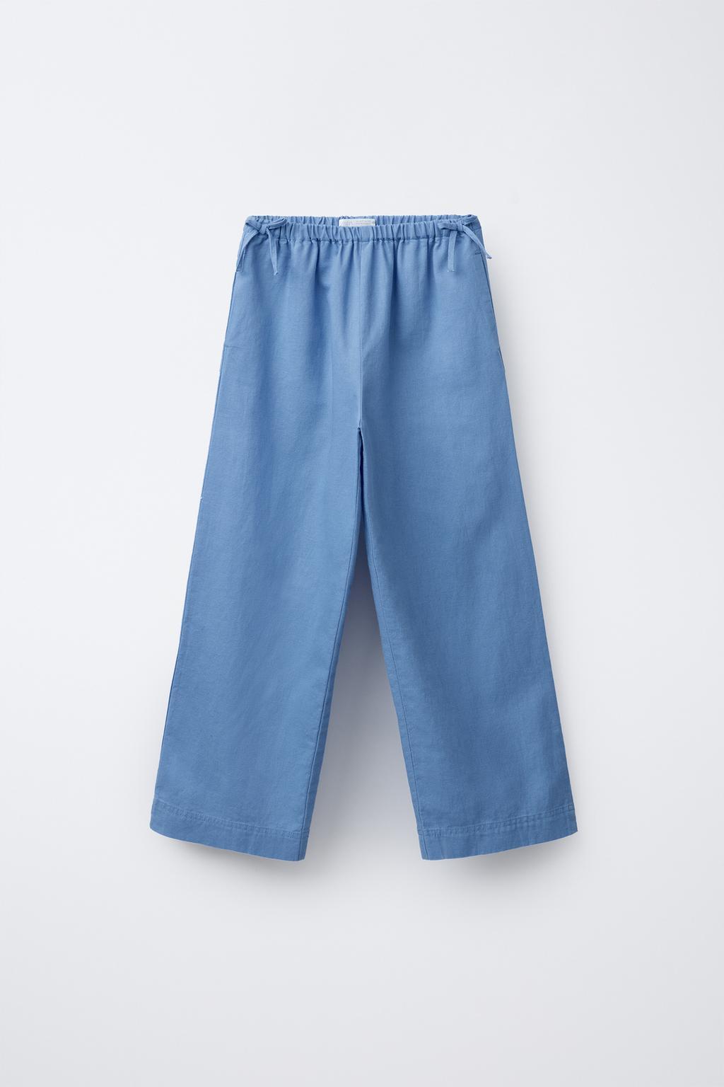 ZARA БРЮКИ ИЗ ХЛОПКА И ЛЬНА С БАНТАМИ, СИНИЙ