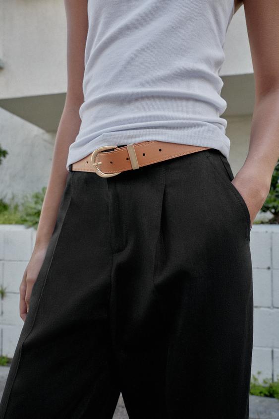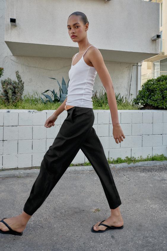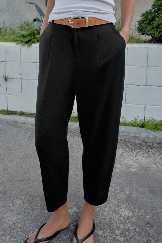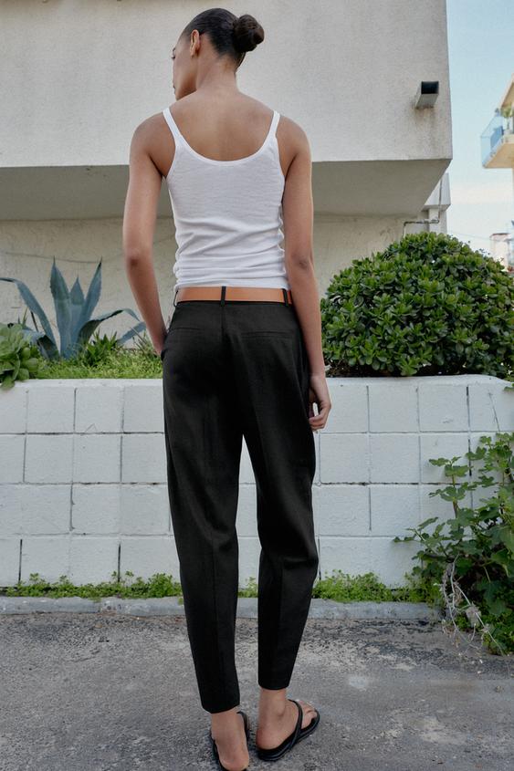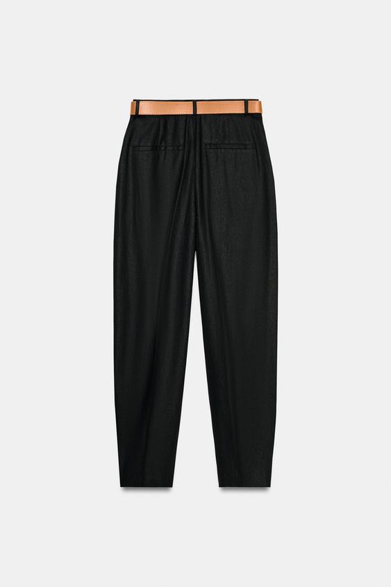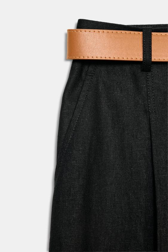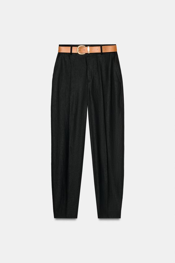 ZARA БРЮКИ ИЗ ЛЬНА С ЗАЩИПАМИ И РЕМНЕМ, ЧЕРНЫЙ