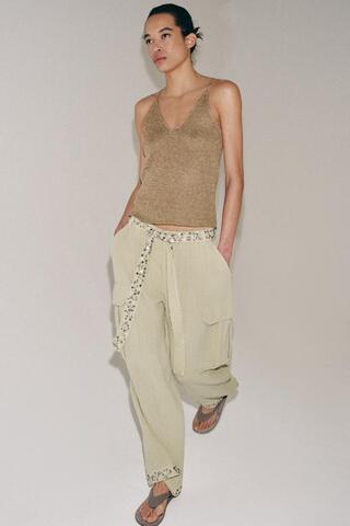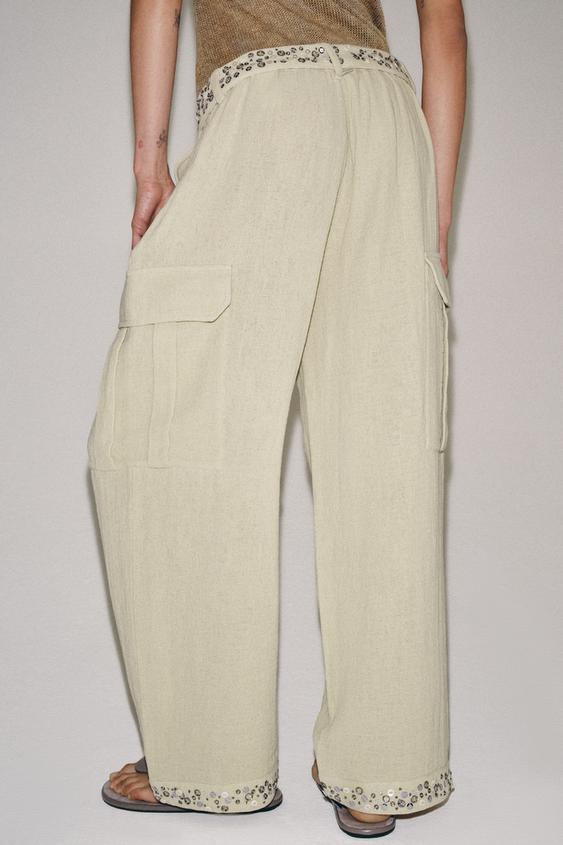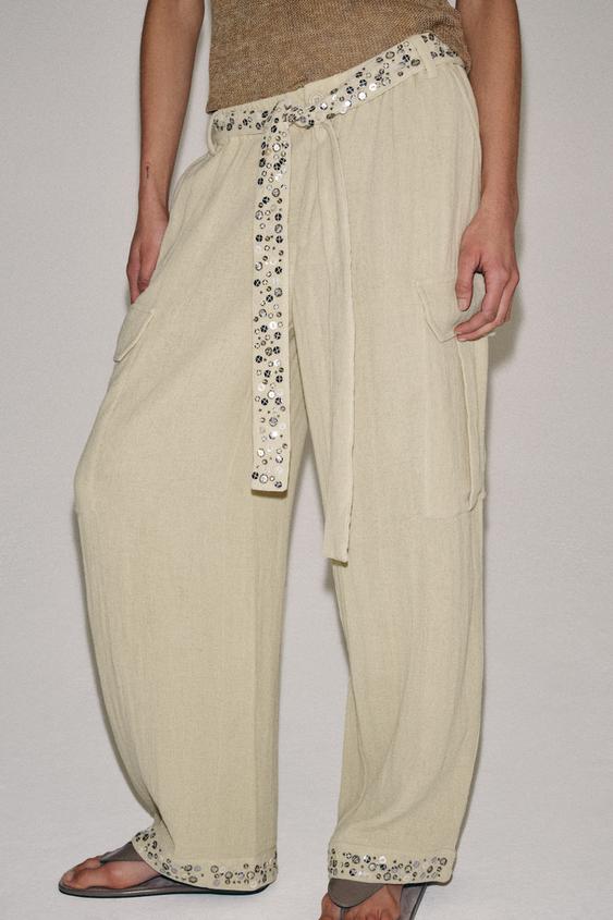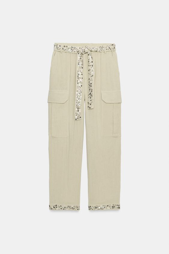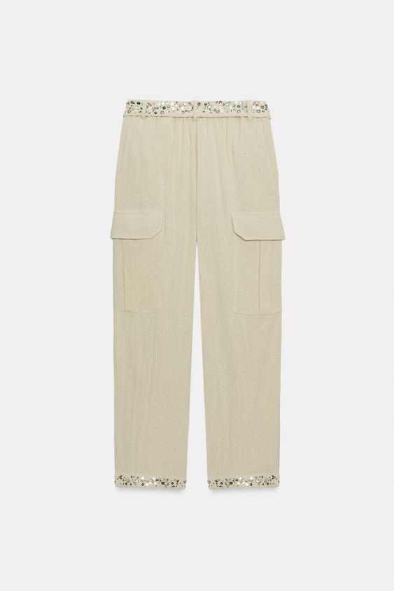 ZARA БРЮКИ КАРГО С ПАЙЕТКАМИ — ZW COLLECTION, СВЕТЛЫЙ ХАКИ