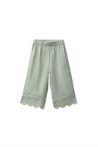 Брюки-кюлоты с эластичным поясом и волнистым краем снизу. Основная ткань — 100% лен.