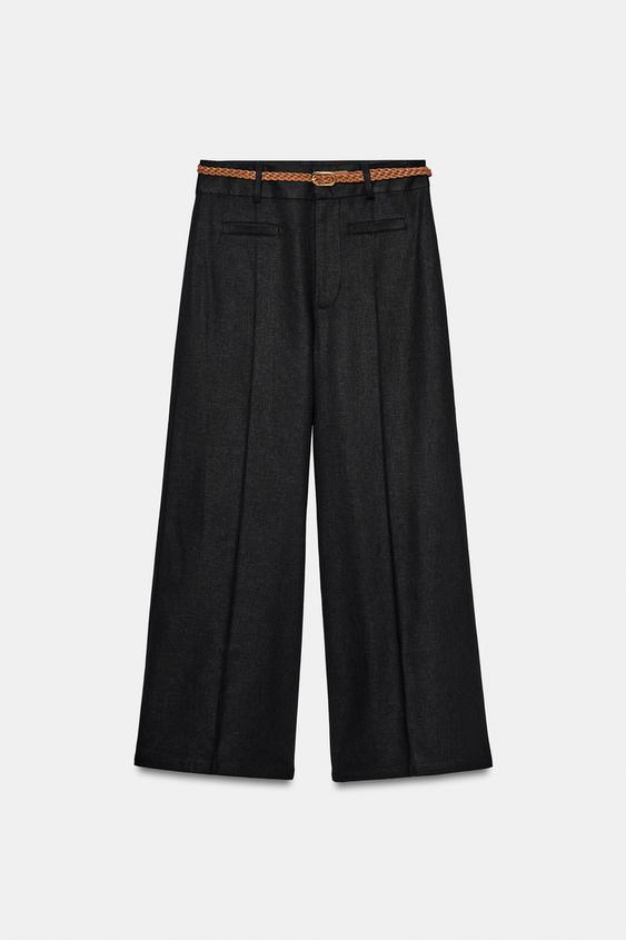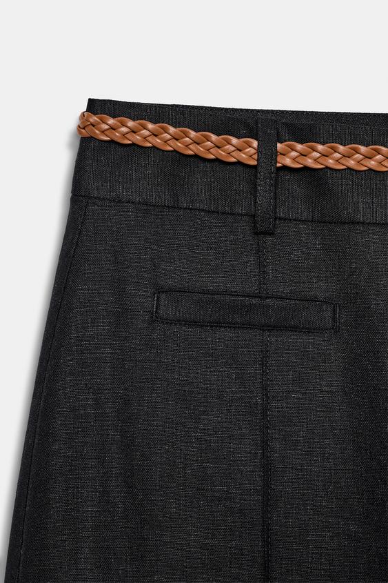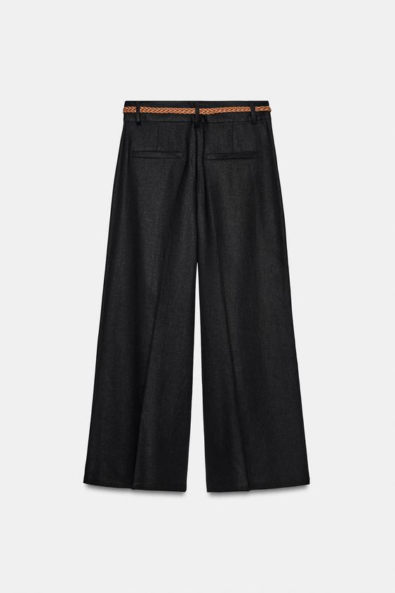 ZARA БРЮКИ-КЮЛОТЫ ИЗ СМЕСОВОГО ЛЬНА С ПЛЕТЕНЫМ ПОЯСОМ, ЧЕРНЫЙ