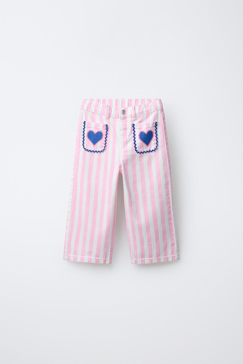 Брюки-кюлоты с регулируемым изнутри поясом. Застегиваются на кнопки. Накладные карманы с вышитыми сердечками спереди. Принт в полоску.