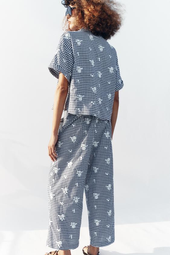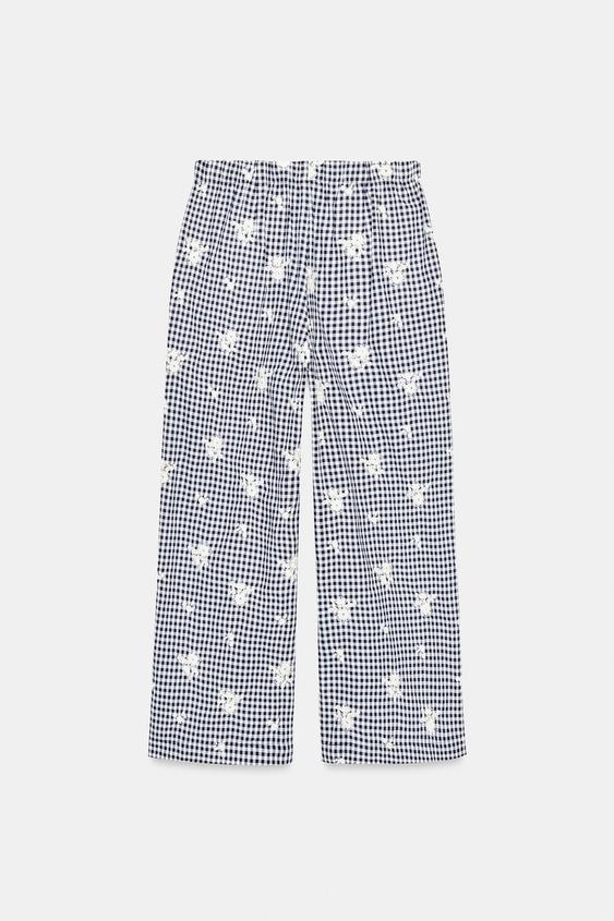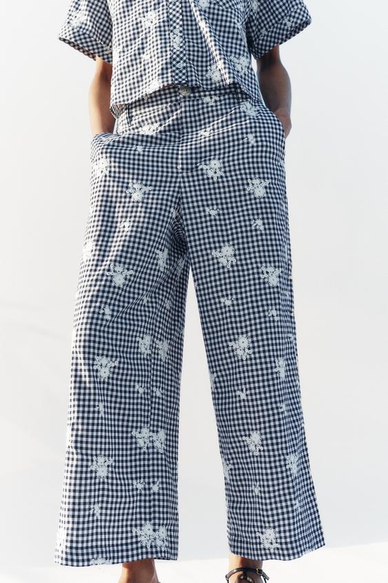ZARA БРЮКИ-КЮЛОТЫ В КЛЕТКУ С ВЫШИВКОЙ В КОМПЛЕКТЕ, ТЕМНО-СИНИЙ/БЕЛЫЙ