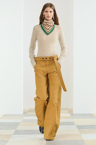 Брюки, изготовленные из хлопка. Средняя посадка и пояс с перемычкой. Передние карманы и задние накладные карманы. Регулируемый пояс на пуговицах из той же ткани. Прямые брюки. Застежка на пуговицах на штанинах и складчатый конец с перемычкой на поясе. Передняя молния и застежка на пуговицы.