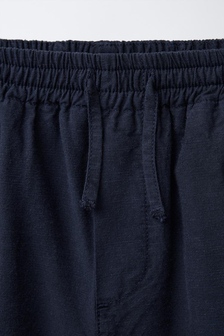 Брюки с эластичным поясом с регулируемыми шнурками. Передние карманы, задние накладные карманы.