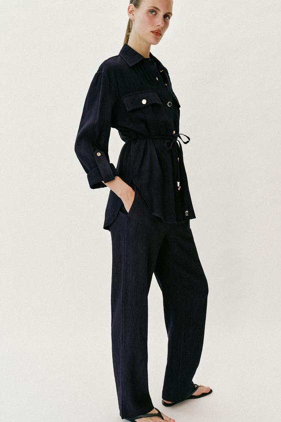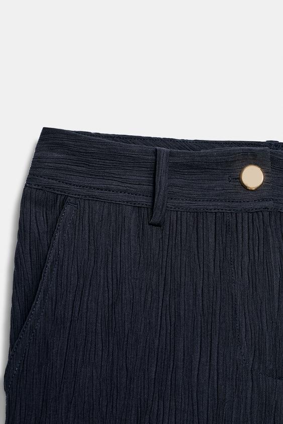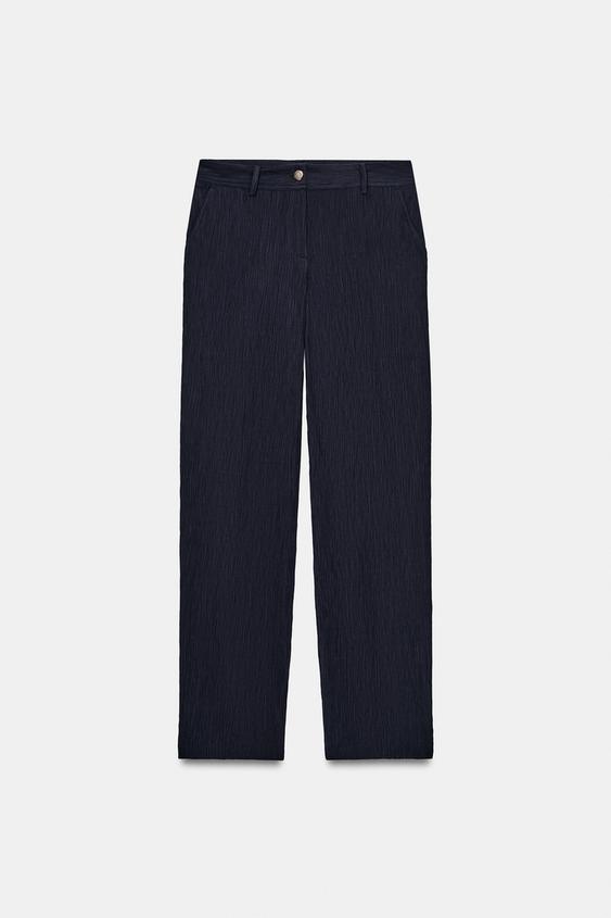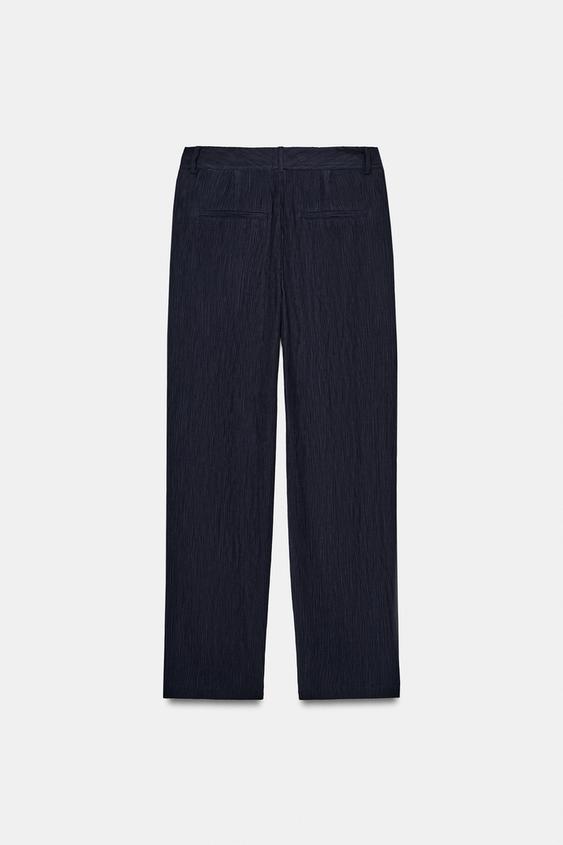 ZARA БРЮКИ ПРЯМОГО КРОЯ С ЭФФЕКТОМ ЖАТКИ, МОРСКОЙ СИНИЙ